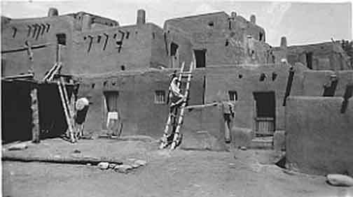 One night at Taos Tony Lujan put us all in his car and drove to the Pueblo. Then he parked in shadow and got out, telling us to be quiet. Then, with his drum, he walked out on the Plaza and sat down on a log near the stream and began singing the old songs. It was a beautiful, clear, moonlit night. After a little while, high up on the other side, we saw a man in a white sheet come out, come down the ladders, cross the Plaza and the little bridge, and sit down beside Tony and join him in singing. Then another and another, until there were five or six old men sitting on that log, singing. It was wonderful, it was wild, the voices were marvelous and it went on for more than two hours.